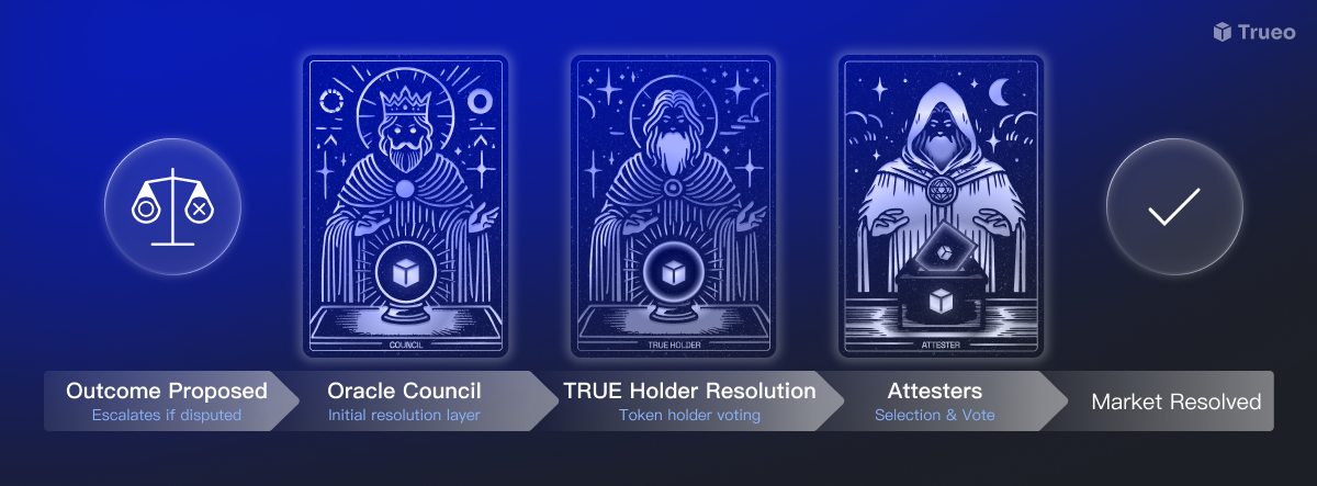 Like most optimistic oracles, Trueo treats proposed resolutions as valid by default unless they are disputed. If a proposed resolution is challenged, the protocol's enshrined oracle system is activated. This system features a multi-stage escalation process that progressively incorporates broader and more intersubjective perspectives.